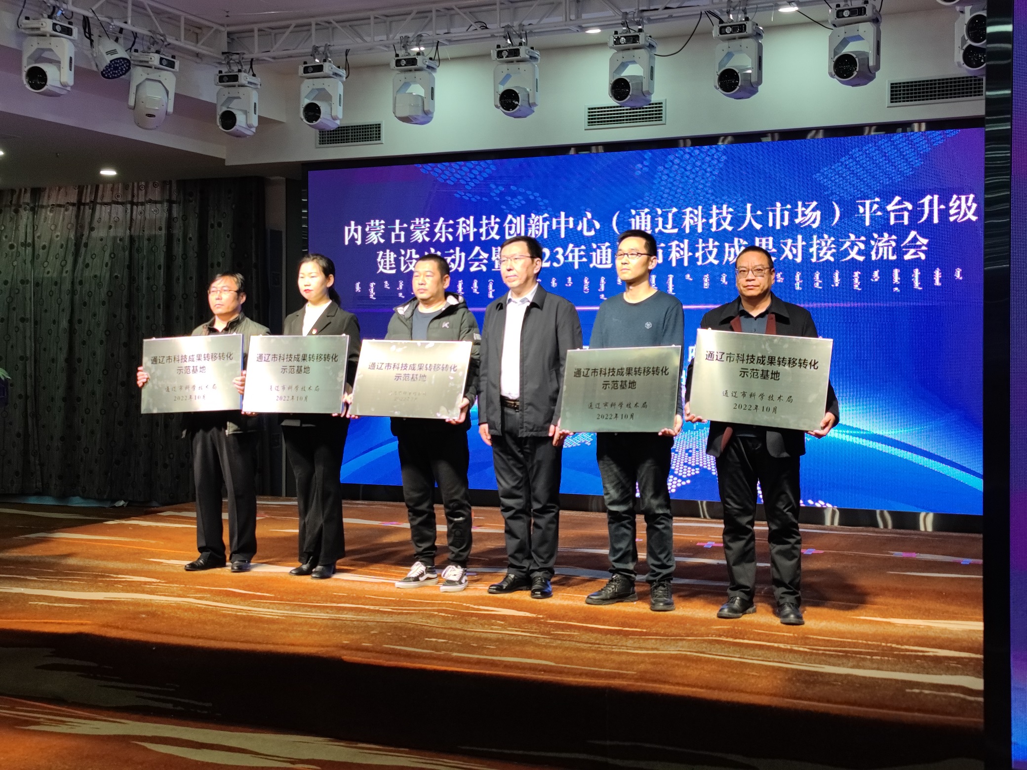 会议为“通辽市科技成果转移转化示范基地”授牌,内蒙古民族大学农业科技园区建设办公室申报的“内蒙古民族大学农业科技园区科技成果转移转化示范基地”获批并接受了牌匾。